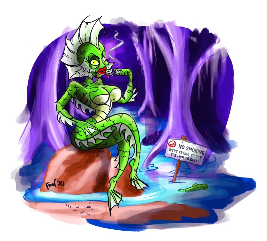 For a while I’ve been drawing cute little illustrations of classic monsters in everyday situations. I started thinking “when you live forever what do you live for?” Probably video games, and not much else. In my opinion, imortality seems pretty depressing so I tried to draw Dracula in a “depression den.” I took a look around my couch and noticed the things I have laying around and thought about drawing that, but had to modify (Dracula probably wouldn’t have a bunch of potato chips, more like blood bags).